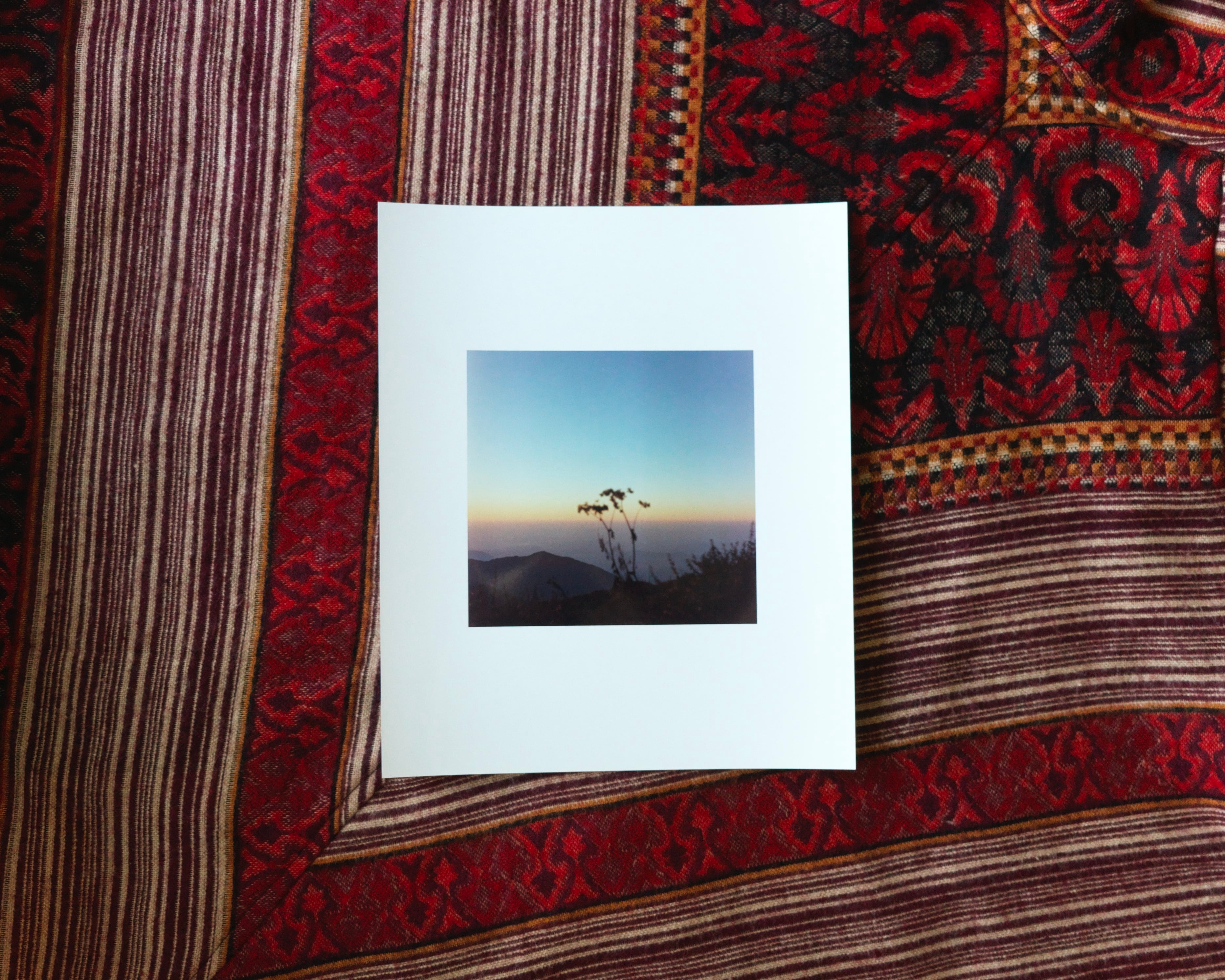このプリントは、果ての世界である旅と日常の生活空間が地続きであるという感覚を示しています。遠い場所で見た光はプリントとして変換されて日常へと溶け込み、その接点は、明確な境界ではなく渚のような曖昧な場所として現れます。